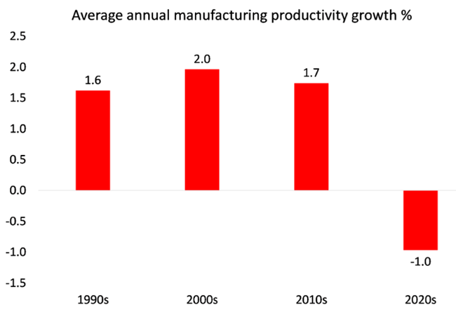 장기적으로 가장 큰 문제는 일본의 인구다일본의 인구는 감소하고 고령화하고 있다이로 인해 1인당 소득 증가율은 전체 GDP 증가율보다 더 높게 나타난다. 2010년 이후 일본의 1인당 실질 GDP는 10.8% 증가한 반면실질 GDP는 9.6% 증가했다그러나 1인당 실질 GDP 증가율마저도 둔화하고 있다노동자들은 과로 상태에 놓여 있다일본은 직원들의 연이은 비극 이후 50년 전 과로사(karoshi)’라는 용어를 만들어냈다대기업들은 이러한 압박을 완화하고 생산성을 높이기 위해 주 4일 근무제를 추진하고 있다그러나 이것이나 다른 어떤 조치도 생산성을 끌어올리는 데 효과를 내고 있다는 징후는 거의 없다생산성 증가율은 이제 사실상 존재하지 않는다.