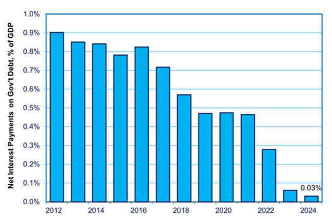 국채 수익률이 상승한 것은 사실이지만순부채 감소와 과거의 초저금리 정책으로 인해 정부 전반의 순이자 지급액은 2024년에 GDP 대비 고작 0.03% 수준으로 낮아졌으며이는 2012년의 거의 1%에서 크게 줄어든 것이다이 수준은 충분히 감당 가능하다.