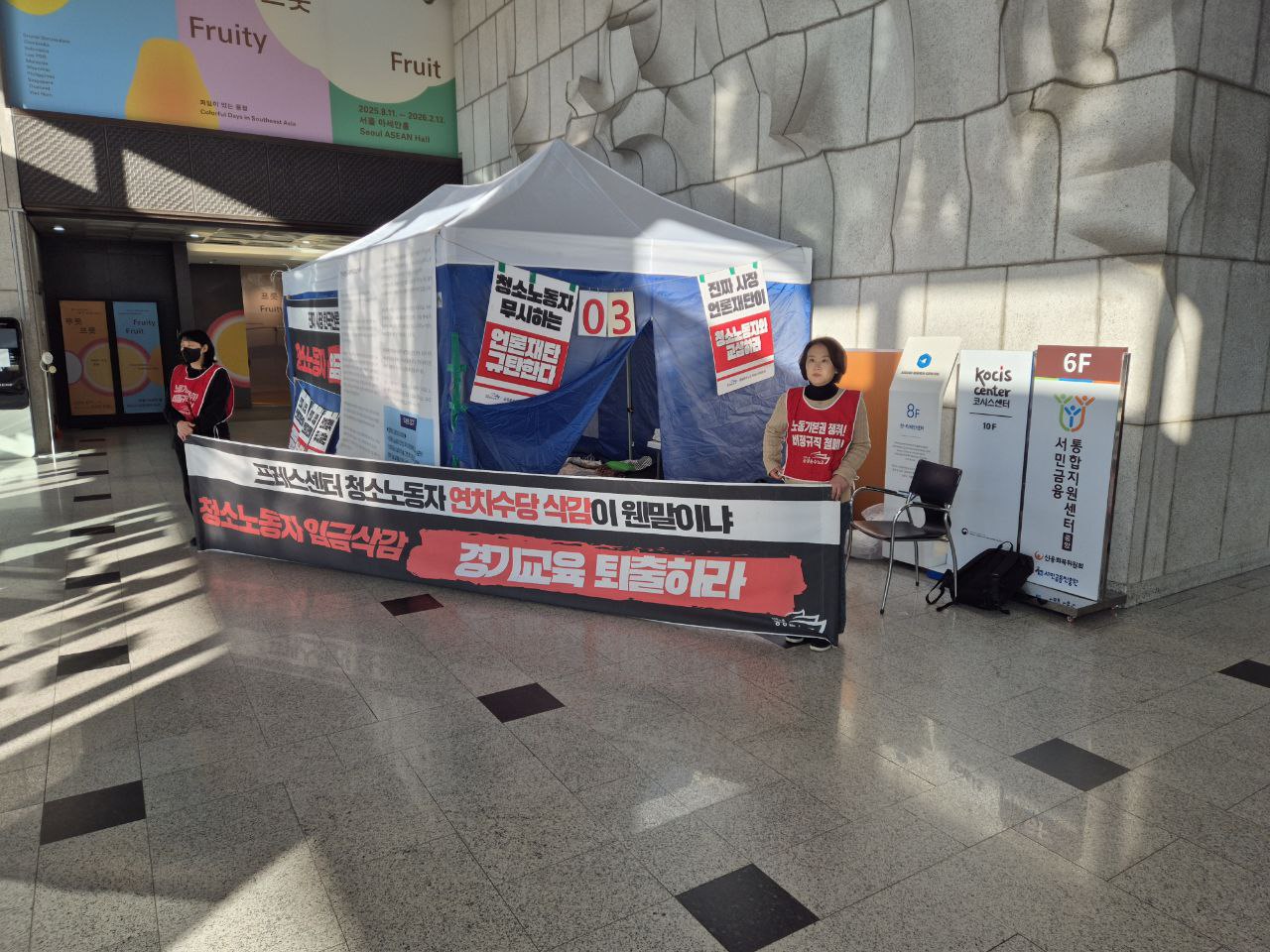 프레스센터는 매년 용역업체가 바뀌고, 우리는 매년 신입사원이 됩니다. 이에 따라 근속 연차도 늘지 않고 항상 같은 자리입니다. 십수 년을 일한 언니들도 어제 들어온 신입 노동자도 처우가 똑같습니다. 그리고 새로운 용역업체가 들어올 때마다 우리가 그동안 투쟁해서 만들어 낸 임금 및 단체협약 승계와 고용 승계를 위해 또다시 사측과 싸워야 합니다. 최저입찰제를 통해 들어온 용역업체는 우리 청소노동자들을 쥐어짜 그 돈을 메우려 하기 때문입니다. 매년 위험부담을 안고 일해야 했고, 한 해도 투쟁 없이 지나간 적이 없었습니다. 2025년에 들어온 ‘경기교육’이라는 용역업체는 그중 최악이었습니다. 일방적으로 임단협 승계를 거부해 우리가 투쟁을 통해 이루어낸 임단협이 한순간에 무용지물이 되었습니다. 임금을 삭감하면서도 노동조합과는 대화하지 않으려 했고, 노동조합을 탄압했습니다.