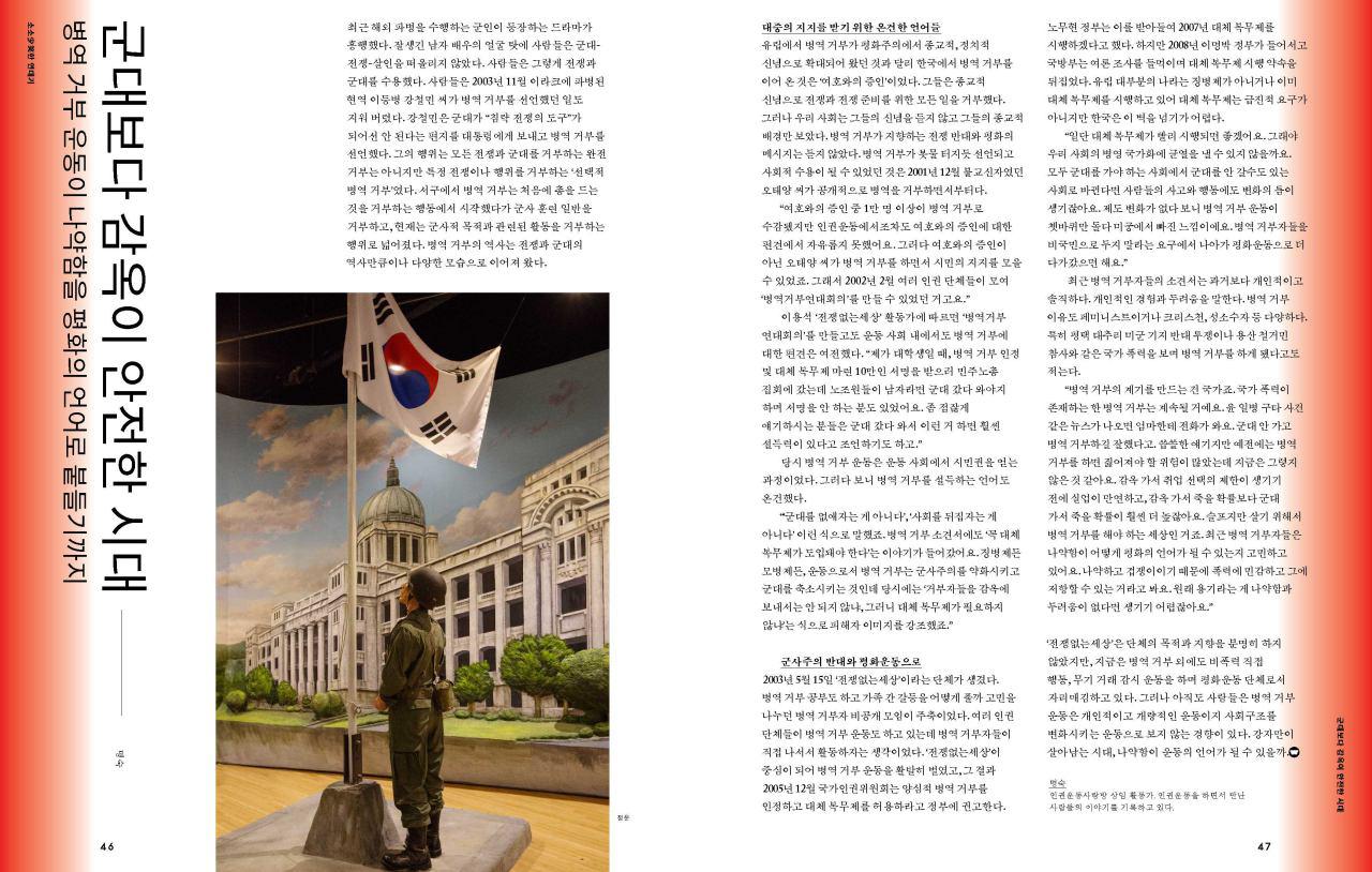 최근 해외 파병 군인이 등장하는 드라마가 흥행했다. 잘생긴 남자 배우의 얼굴, 화려한 전투 장면 등으로 사람들은 군대 – 전쟁 – 살인을 떠올리지 않았다. 사람들은 그렇게 전쟁과 군대를 수용했다. 사람들은 2003년 11월 이라크에 파병된 현역 이등병 강철민 씨가 병역 거부를 선언했던 일도 지워 버렸다. 강철민은 군대가 “침략 전쟁의 도구”가 되어선 안 된다는 편지를 대통령에게 보내고 병역 거부를 선언했다. 그의 행위는 모든 전쟁과 군대를 거부하는 완전 거부는 아니지만 특정 전쟁이나 행위를 거부하는 ‘선택적 병역 거부’였다. 서구에서 병역 거부는 처음에 총을 드는 것을 거부하는 행동에서 시작했다가 군사 훈련 일반을 거부하고, 현재는 군사적 목적과 관련된 활동을 거부하는 행위로 넓어졌다. 병역 거부의 역사는 전쟁과 군대의 역사만큼이나 다양한 모습으로 이어져 왔다.
