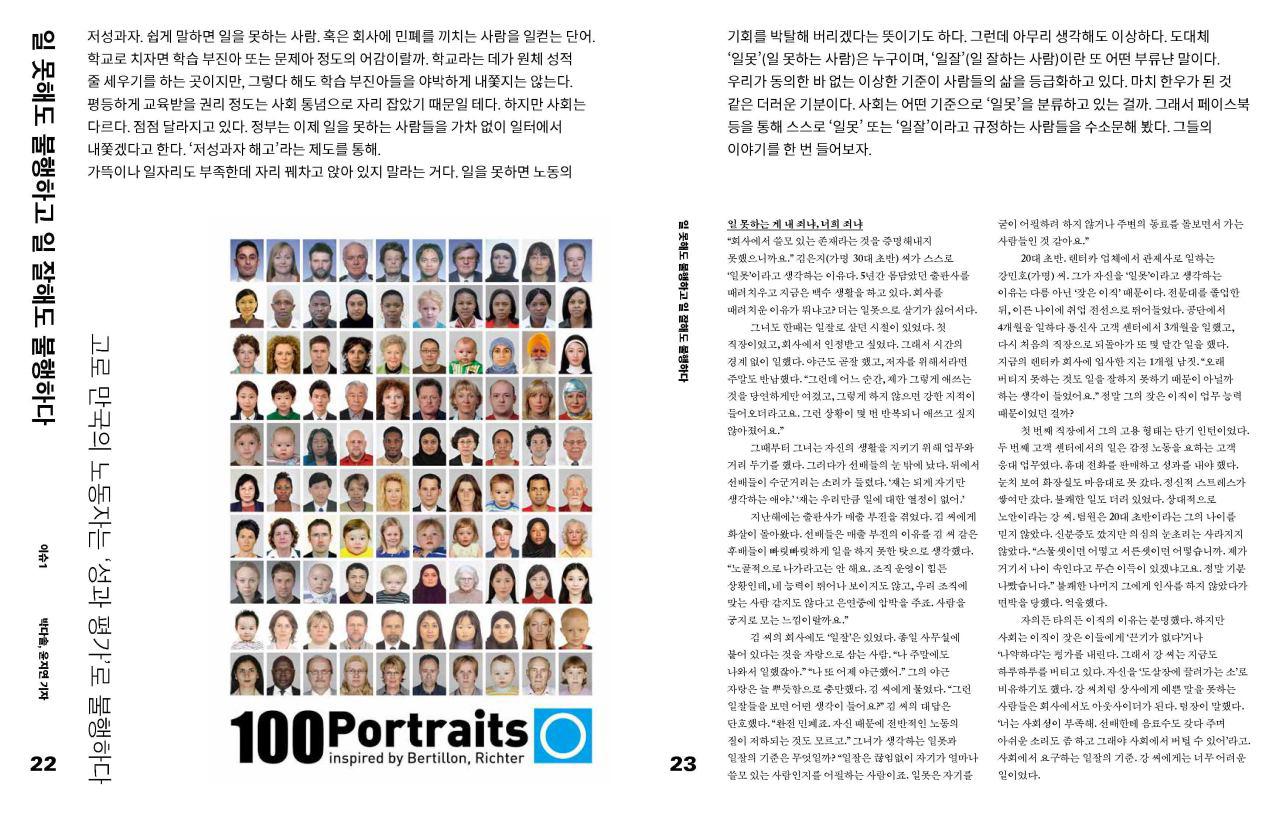 가뜩이나 일자리도 부족한데 자리 꿰차고 앉아 있지 말라는 거다. 일을 못하면 노동의 기회를 박탈해 버리겠다는 뜻이기도 하다. 그런데 아무리 생각해도 이상하다. 도대체 ‘일못’(일 못하는 사람)은 누구이며, ‘일잘’(일 잘하는 사람)이란 또 어떤 부류냔 말이다. 우리가 동의한 바 없는 이상한 기준이 사람들의 삶을 등급화하고 있다. 마치 한우가 된 것 같은 기분이다. 사회는 어떤 기준으로 ‘일못’을 분류하고 있는 걸까. 그래서 페이스북 등을 통해 스스로 ‘일못’ 또는 ‘일잘’이라고 규정하는 사람들을 수소문했다. 그들의 이야기를 한번 들어 보자.