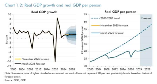 재정책임청(OBR) 보고서는 영국이 투자를 유도하기 위해 기업 부문의 수익성을 높여야 한다는 점을 분명하게 보여 준다. OBR은 2020년 이후 기업 이윤이 GDP 대비 비중에서 하락 추세를 보여 왔다고 지적한다기업 자본의 실질 수익률은 2022년 13.75%에서 2025년 11.75%로 떨어졌다이 수익률은 노동 소득을 희생시키는 방식으로 다시 상승해야 한다. “주간 임금 증가율은 2024년 2.5%에서 2025년 말에는 1% 이하로 둔화했다중기적으로 우리는 기업들이 최근 몇 년 동안 비교적 낮았던 자본 수익률을 회복하는 과정에서 실질 시간당 임금 증가율이 생산성 증가율보다 낮은 연간 약 0.5% 수준에 머물 것이라고 가정한다.” 기업들은 이윤 마진을 재건해야 한다.” 그러나 그렇게 되더라도 OBR은 2030년의 실질 수익률이 겨우 12퍼센트를 약간 웃도는 수준에 그칠 것으로 전망한다.