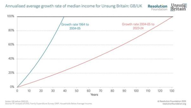 이름 없이 버텨 온 영국(Unsung Britain)”은 가처분소득 분포의 하위 절반에 속한 1,300만 노동연령 가구(2,700만 명을 포함한다)를 가리킨다. “이 가구들은 이전 세대보다 더 많이 일하고더 많이 돌보고더 많이 기여하고 있지만이러한 노력에 대한 보상은 정체되어 있다.” 이 집단의 전형적인 가처분소득은 2000년대 중반 이후 연평균 겨우 0.5퍼센트 증가하는 데 그쳤다이 수치는 이전 수십 년 동안 누렸던 성장의 극히 일부에 불과하다. 2004~05년까지의 40년 동안 비슷한 가구들의 소득은 두 배로 증가했다그러나 오늘날과 같은 속도라면 같은 수준의 개선을 달성하는 데 130년이 넘게 걸릴 것이다.