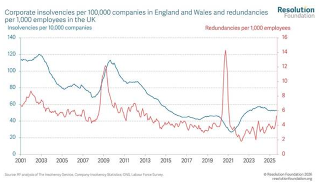 <잉글랜드와 웨일스에서 기업 10만 개당 기업 파산 건수와 영국에서 노동자 1,000명당 정리해고 규모>