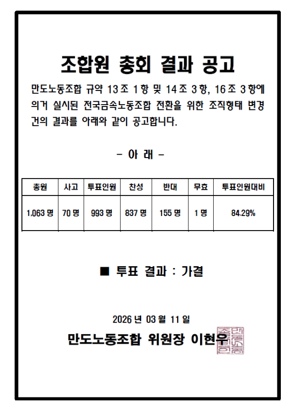 금속노조 전환을 위한 조직형태변경 조합원 총회 결과 공고. 출처: 만도노동조합
