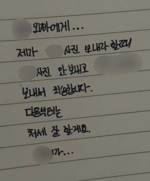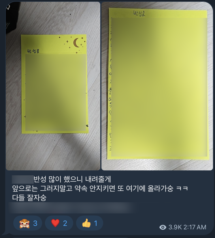 (왼)’ㅇ’ 박제방 운영자가 공개한 신상협박 피해 여성의 ‘반성문’, (오)’ㅇ’ 박제방의 피해 여성들에게 개인정보를 내리는 대가로 금전을 요구하는 ‘신상협박’에 관련한 게시글