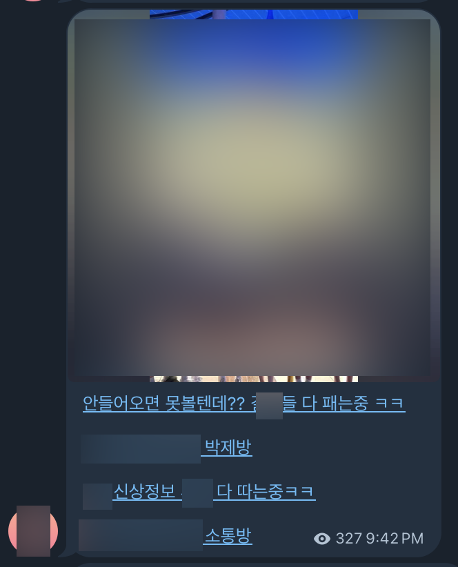 취재 과정에서는 박제방뿐 아니라 동남아 박제방, 불법촬영물 공유방(‘영상방’), 투자리딩 사기방, 여러 범죄 채널 링크를 공유하는 허브 역할을 하는 방(‘링공방’) 등도 어렵지 않게 확인됐다. ‘동남아 박제방’인 ‘ㅂ’ 박제방은 ‘1번방’과 ‘2번방’을 운영하는 등, N번방의 범죄 형태를 그대로 답습한 모습을 보이기도 했다. ‘링공방’은 아동과 청소년을 대상으로 한다는 박제방과 불법촬영물 공유방의 링크가 다수 발견되었고, 계좌매입, 불법토토, 대포유심 사업 채널 링크를 홍보하는 등 범죄 네트워크의 허브 역할을 했다.
