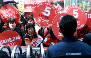18대 대선에서 투쟁하는 노동자 대통령 후보를 표방한 무소속 김소연 후보가 강남 삼성본관 앞에서 선거투쟁 선포식과 함께 ‘삼성 OUT’을 촉구하...