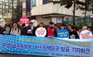 학계, 노동, 시민사회단체 등으로 구성된 ‘의료민영화 저지와 무상의료 실현을 위한 운동본부(무상의료운동본부)’가 18대 대통령선거 정책요구안을 ...