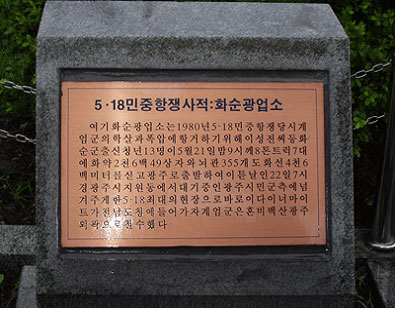 신발 바닥에 잔뜩 달라붙은 검은 탄가루를 고인 빗물에 씻어내며 탄광 정문을 나올 때였다. 저만치 웅크리고 앉아있는 조그마한 비석이 내 눈에 얼핏 들어왔다. 으레, 회사 연혁 따위를 세긴 것이겠거니 하고 심드렁하게 그곳으로 가보았다. 그러나 이게 웬일인가. ‘5· 18민중항쟁 사적비’가 그곳에 세워져 있었다.