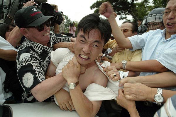 보수우익단체의 인공기 화형식을 몸으로 막고 있는 경찰. 이날 화형식에 사용하려던 인공기를 사복경찰이 긴급 회수하자, 이에 분노한 보수우익단체 회원들이 그 경찰을 붙잡고 심하게 구타를 하고 있다. 이 경찰은 이들로부터 빨갱이취급을 받으면서 웃도리가 갈기갈기 찢겼다. 결국 이 경찰은 이날 머리를 8바늘 꿰메는 수술을 받았다고 한다.
