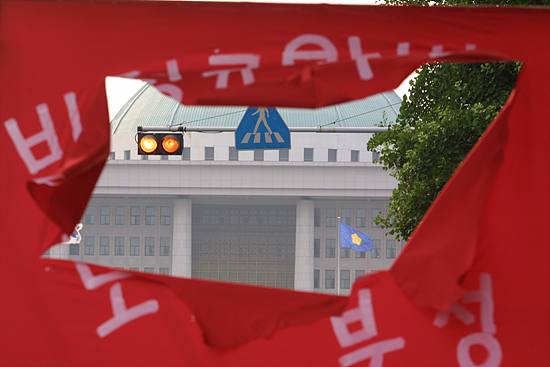 6월21일 양 노총 집회에서 양노총이라는 낫으로 '비정규 악법, 노동법부정'이라는 글귀가 적힌 현수막을 집고난 후 찢어진 천 사이로 보이는 국회입니다.