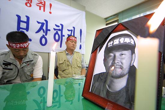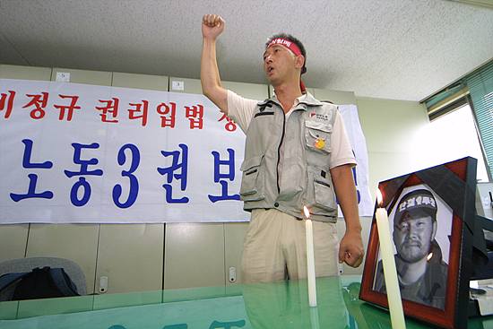 비정규 노조 대표자들이 서울 노동청에 들어가 소중히 가방에서 내어 놓은 것은 열사의 영정이었습니다. 그리고 영정앞에 초가 켜졌습니다. 그 영정앞에서 노동부의 관료는 위에 비정규 노동자들의 요구를 잘 전달하겠다는 말만 앵무새 처럼 되풀이 했습니다.