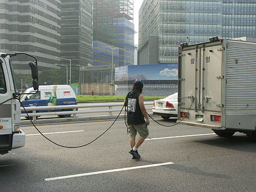 알만한 사람은 다 알지만 항상 노동자들 집회를위해 고군분투하는 많은 사람들중에 음향과 무대등을 준비하는 동지들이 있다. 생업이라고 스스로는 말하지만 준비하고 진행하는 과정에서 항상 가장 먼저 싸우는 일이 다반사다. 이 분도 매연먹어가며 다들 덥다고 호들갑(?)떠는데 묵묵히 걸어가는 모습이 안쓰럽고 왠지 가슴이 무거웠다...누구하나 돌아가며 하자거나 그런건 전혀 없었다. 경찰의 엄청난 나팔차를 선봉에 세우며 형사들의 호위를 받고 행진하는 집회에 뭔 힘이 나겠나...담부턴 아예 경찰 방송차를 빌려쓰는게 차라리 낮지 않을까 싶다. 이따위로 집회할라면...괜한 사람 고생시키지 말고
