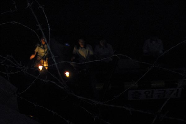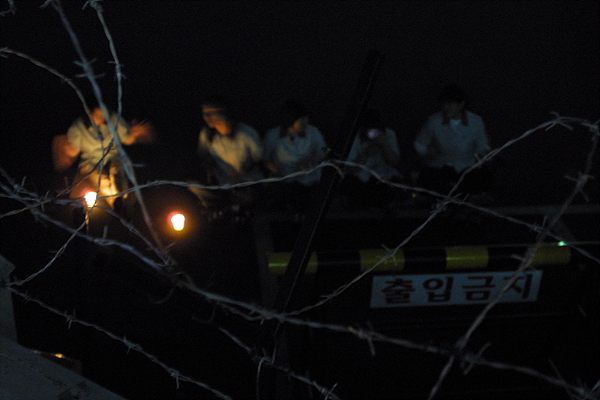 | 담장 너머 철창 밖에서 본 기륭전자 촛불문화제 기륭노동자 들은 촛불을 들고 밥그릇으로 담장 밖 노동자들의 구호에 화답했다 |