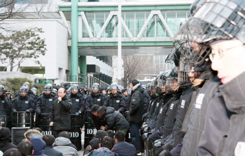 ▲ 항의 집회를 하려고 조합원들이 움직이자 경찰들이 바짝 붙어 따라다닌다 <%=orgin_start%> [출처: ]<%=orgin_end%> |