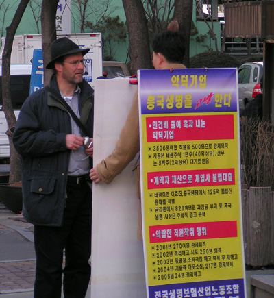 2월 17일 흥국생명 남대문 지점 앞에서 진행된 해고자 결의대회에서 포착된 현장입니다. 외국인들은 관광객들은 궁금한게 너무 많은 거 같습니다. 이사람 뿐만 아니라 곁에서 취재하고 있던 저도 외국인이 질문해서 어찌나 놀랐던지..