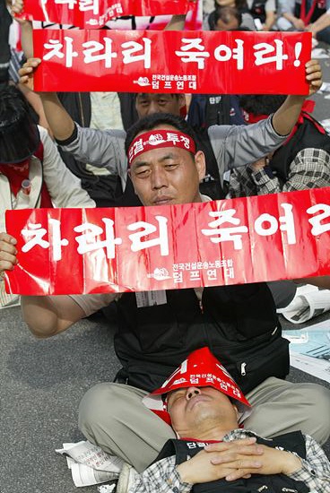 | 파업에 돌입한 덤프 연대 노동자들이다. 초여름이 느껴지는 5월1일 메이데이현장에서 동지들 사이에서 단잠을 자는 노동자들이 부러웠다. 파업이나 들어가야 저임금, 장시간 노동에 잠이 부족한 노동자들은 단잠을 잘 수 있다. |