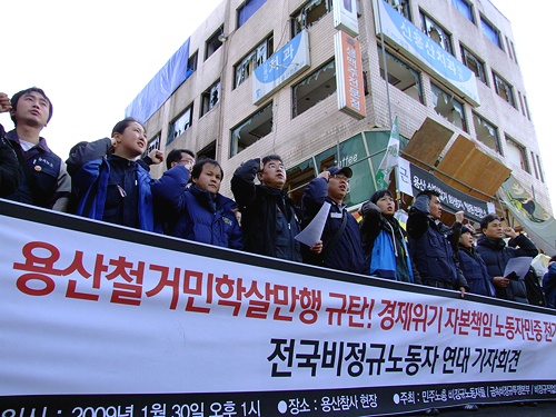 그날 오후 1시, 용산참사 현장 앞에서는 기륭전자분회, GM대우비정규직지회 등 투쟁하는 비정규노동자들이 기자회견을 열어 “가난한 철거민들을 불태워죽이고, 비정규악법으로 비정규노동자들을 죽음으로 내모는 이명박 정권에 맞서 비정규노동자들은 (철거민들과 연대하며) 힘껏 싸워나갈 것”이라는 결의를 밝혔다.