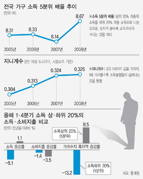 이에 따라 소득 상위 20% 계층과 소득 하위 20% 계층의 소득격차는 8.67배로, 사상 최대 수준으로 벌어졌다.
