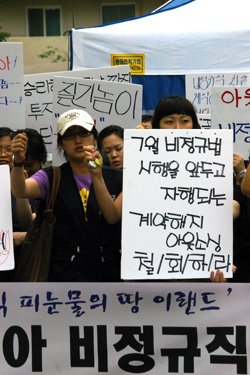 결국 비정규법이 시행되기 전부터 비정규직의 대량해고는 시작되고 있다. 대표적인 사례는 뉴코아다. 김연배 뉴코아 관리담당이사는 당당하게 “비정규직 보호법에 차별시정과 관련한 부분이 담겨져 있기 때문에 회사는 7월 1일부터 법을 지켜야 할 의무가 있고, 그렇기 때문에 (아웃소싱을) 진행하고 있다”라고 당당하게 말했다. 비정규법에 대해 정부가 기간제, 파견직 노동자가 2년 이상 근무하면 정규직이 될 수 있는 보호법이라고 한 말은 거짓임이 증명되고 있는 것이다.