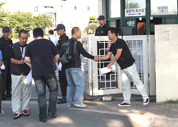 ▲ 9월1일 쌍용차 지부 대의원들과 상집간부들이 정문 앞에서 '총회소집은 어용노조 만들기 수순'이라는 내용의 노동조합 선전물을 배포 했다. [출처: 쌍용차 지부] |