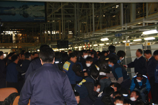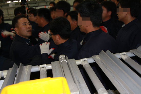 30여분간 몸싸움이 벌어졌고, 정규직 관리자, 경비 200여명은 연좌농성 하는 비정규 노동자를 하나하나 끌어냈다.