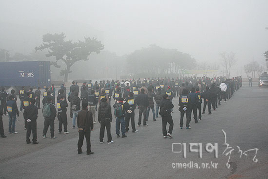 한편 금속노조에서 결정한 권역별집회가 아산공장 정문앞에서 오후4시에 열렸다. 사측은 18일 오후 정문에 컨테이너 박스, 일명 ‘몽구산성’를 올렸다. 그 옆에 미처 병원으로 이송되지 못했던 비정규 노동자 4명이 구급차를 기다리고 있었다. (기사제휴=미디어충청)