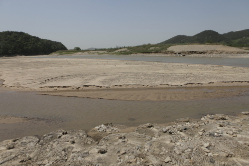 ▲ 남한강 지류인 청미천. 지난 4월 초 공동조사단이 청미천을 방문했을 당시 하상유지공이 반 정도 완성된 상태였으나 이번에 방문했을 때 하상유지공은 다 무너지고 그 앞에 모래톱이 생겨났다. 모래톱은 원래 있었던 것으로 준설로 사라졌었다. [출처: 녹색연합] |