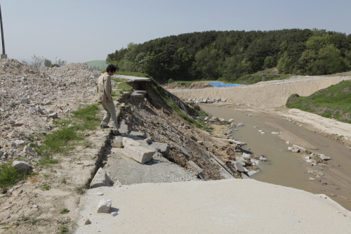 ▲ 남한강 지류 중 하나인 한천. 이번 비로 제방이 가장 심각하게 무너진 곳이다. 준설이 거의 끝난 이 시점부터는 모든 지천에서 이러한 피해가 일어날 것으로 예상된다. [출처: 녹색연합] |