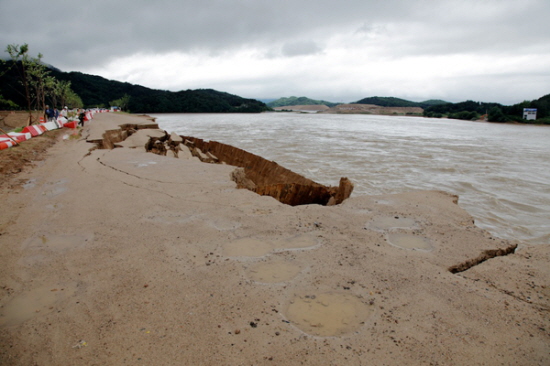 경북 상주시 4대강 사업 33공구의 상주보 제방도 300m 정도가 강물에 깎여나갔다. 지난달 초 내린 비로 이미 100m 이상이 유실됐던 상주보 제방은 이번 비로 다시 경사면이 가파르게 깎여나갔고 제방 위 도로 일부도 무너져 내렸다.