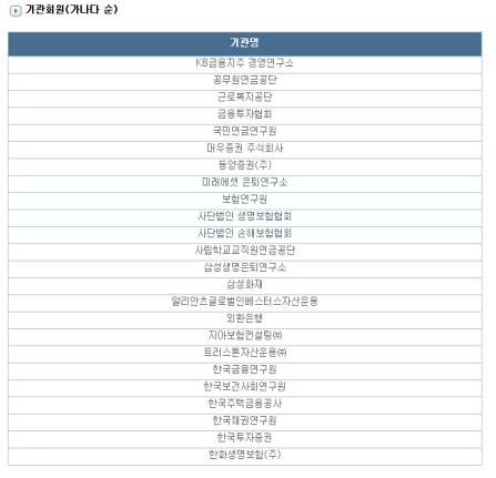 우선 이 학회의 기관회원으로 가입된 기관은 총 24개로 이 중 민간 금융기관 및 금융기관부설 연구소와 민간연구소가 79%에 이른다.