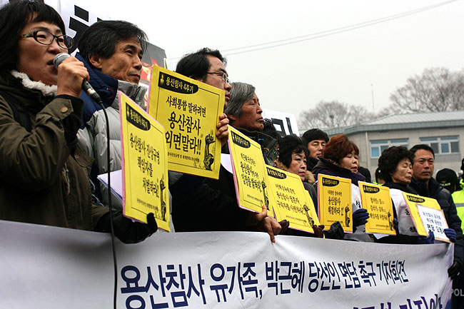 유가족들과 용산참사 진상규명위원회는 24일 오전, 삼청동 대통령직 인수위원회 앞에서 기자회견을 열어 박근혜 당선인의 불통을 규탄하고 면담을 촉구했다. 유가족들은 “박 당선인이 유가족들을 만나 진상규명과 구속철거민 사면, 제도개선에 대한 입장을 밝혀야 한다”고 주장했다. 유가족 전재숙 씨는 “인수위 출범 첫 날부터 계속 면담을 신청했지만 박근혜 당선인은 면담을 거부하고 있다”면서 “인수위와 박 당선인의 면담확정을 받아야 돌아가겠다”고 말했다.