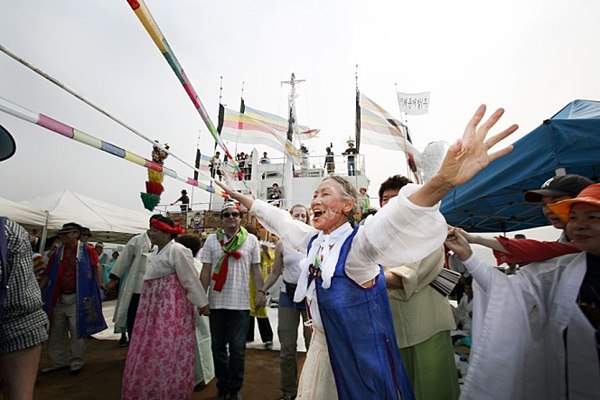 그런데 근현대사의 상처를 여기에서 그치지 않고 연평해전까지 보여주며, 굿의 치유능력을 넌지시 비친다. “세상 일들... 마음 병 고치는 큰 무당이 되것수다”라고 만신 김금화가 신내림 받을 때 했던 말처럼 말이다. 가장 업신여김 받던 민중이었기 그녀였기에 일제 강점기와 한국전쟁에서 죽어간 넋을 위로해주는 굿이 더 영험했는지도 모를 일이다. 특히 경기도 파주의 초라한 적군 묘지(한국전쟁 직후 전국에 산재한 북한군과 중국군 유해 1000여 구를 모아 만든 공동묘지)에서 벌인 진오귀 장면이 그렇다. 김금화도 전쟁을 겪었기에 그 아픔을 잘 알지 않는가. 그녀는 소리를 왼다. “조그만 상자에다 머리만 묻은 놈, 팔 다리만 묻은 놈….” 그리고 과장이 아니라 실제 있었던 폭력임을 기억하자는 듯 이어지는 시체가 발굴되던 기록사진. 이렇듯 수많은 기록영상과 기록사진을 적절하게 배치한 점이 이 영화의 매력이다. 그 후 제자 만신 한명이 넋대를 잡고 죽은 넋을 진심으로 위로하는 장면에서 그 울음이 너무나 서러워 그만 나도 눈물이 나왔다.