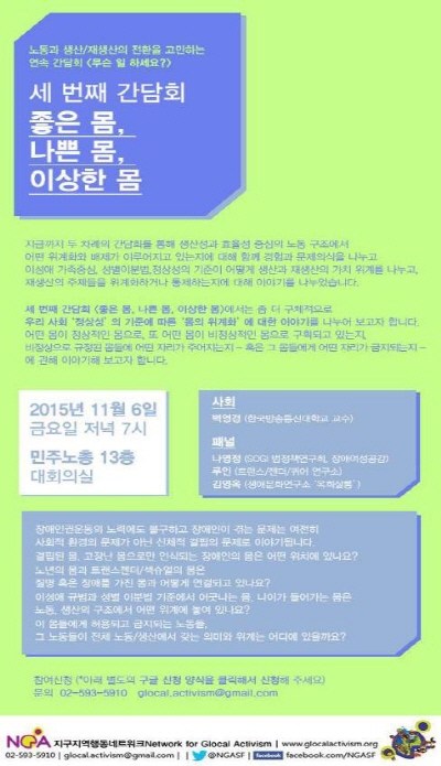 오는 11월 6일 저녁 7시 반, 민주노총 대회의실(서울 서대문역 인근)에서 열리는 세 번째 간담회 <좋은 몸, 이상한 몸, 나쁜 몸>에서도 정상성과 패러다임에 관한 논의가 이어진다. SOGI(성적지향·성정체성)법정책연구회 및 장애여성공감의 연구원인 나영정 씨, 트랜스/젠더/퀴어연구소 루인 씨, 생애문화연구소 ‘옥희살롱’의 김영옥 씨가 패널로 참석하며 방송통신대학교 교수 백영경 씨가 사회를 맡을 다음 간담회에서는 신체적 정상성이라는 기준으로 행해지는 몸의 위계화와 그 위계의 낮은 곳에 놓이는 장애인, 성소수자, 노년여성 등의 삶을 중심으로 논의가 진행될 예정이다.