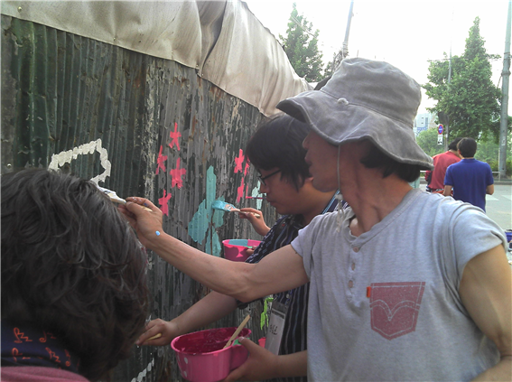 포이동 266번지에 연대한 사람들은 응원문화제를 준비했고 파견미술팀은 붓을 들었다. 응원문화제에 참석한 학생들과 마을입구 펜스에 이미지 작업을 하기로 하고는 잠시 이야기를 나누었다. 우리가 살고 싶은 공간, 마을 사람들이 원하는 공간을 이미지로 만들어 보자고. 빌딩과 고층건물이 서울을 뒤덮고 있는 상황에서 이 공간만은 소박한 집들이 옹기종기 만들어졌으면 좋겠다고 이야기하고 이윤엽 작가의 진행으로 이미지 작업에 들어갔다.