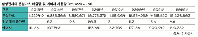 삼성전자의 연간 전력사용량은 2015년 15.4TWh, 2016년 16.6TWh, 2017년 18.5TWh, 2018년 20.6TWh, 2019년 21.2TWh, 2020년 22.9TWh, 2021년 25.8TWh1로 한 번도 줄지 않고 꾸준히 증가했다. 2021년에만 서울시 전체의 가정용 전력 사용보다 1.8배에 달하는 전력을 사용했다. 온실가스 배출량 또한 해마다 높은 증가율을 보이고 있다. 지난해 삼성전자의 온실가스 배출량은 약 1,520만 톤이었는데, 이는 기업의 온실가스 배출을 줄이기 위해 국내에 배출권거래제가 시행된 2015년보다 126% 증가한 양으로 국내 상위 30개 온실가스 다배출 기업 중에서 가장 높은 증가율이다.