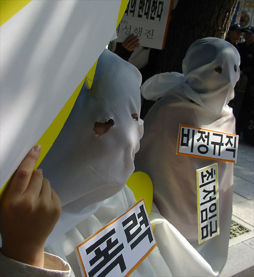 이어 정지현 전국불안정노동철폐연대 사무처장은 "연일 언론에서는 사법고시에 합격한 여성들이 최대라며 여성들의 권리가 많이 신장되었다고 이야기하지만 현실은 그렇지 않다"며 "오늘 아침에도 저임금에 시달리다 못참아 싸우던 기륭전자 여성노동자들 경찰들이 무자비하게 잡아갔다. 엔텍 여성노동자들은 손가락이 구부러지는지도 모르고 일하다가 싸우고 있으며, KTX 여승무원들은 철도의 꽃이라 이야기하지만 저임금 비정규직 노동자이다. 이렇게 싸우고 있는 여성노동자들을 잊어서는 안된다"며 여성노동자들의 삶에 대해 설명했다. 이어 "여성노동자들은 임금 몇 푼 올려달라고 싸우는 것이 아니라 당당한 노동자로서 자신의 삶을 선언하는 것이다"며 여성노동자들의 투쟁에 연대할 것을 호소했다.