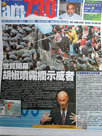 물론 민간과 경찰과의 마찰을 비판하는 논조도 다수 있으나 신문에는 휴교 일정에 집회에 참가한 2명의 중학생 인터뷰와 사진을 싣거나, '홍콩 시민들이 시위에 감염되고 있다'고 제목을 뽑으며 아이를 데리고 나온 홍콩 시민의 인터뷰를 실었다. 그는 "WTO 투쟁의 역동적인 집회에 함께 하고 싶어 나왔다"며 자발적 참여를 강조하는 내용이었다.