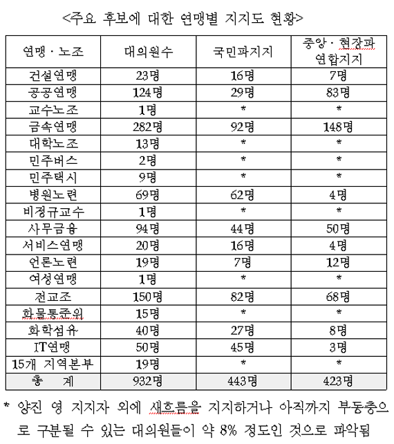 노사대책팀은 이러한 분석의 근거로 '주요 후보에 대한 연맹별 지지도 현황'을 아래 표와 같이 자세하게 제시했다.
