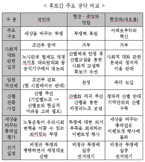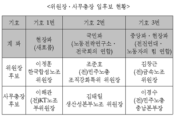 위 요약과 관련, 노사대책팀은 "국민파는 노연(벽제파)과 전국회의가 연합하여 '조준호,김태일'로 호부조를 구성하고, 중앙파는 '김창근,이경수' 후보조를 중심으로 노동자의힘과의 연합 후보조를, 현장파인 새흐름은 '이정훈,이해관' 후보조를 구성하여 출마"했다고 밝히고 있다.
