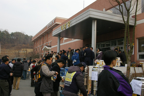 ▲ 37차 임시대의원대회가 열리는 '천안상록리조트' 대강당 앞에 모여 있는 대의원들 |