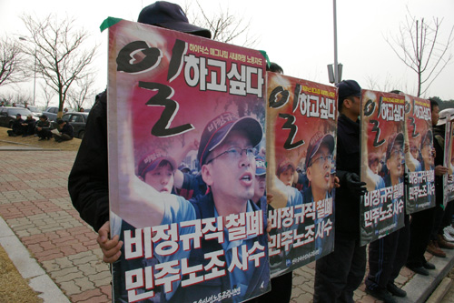 ▲ 하이닉스매그나칩사내하청지회가 대의원대회 장소에서 피켓을 들고 선전전을 진행하고 있다. |