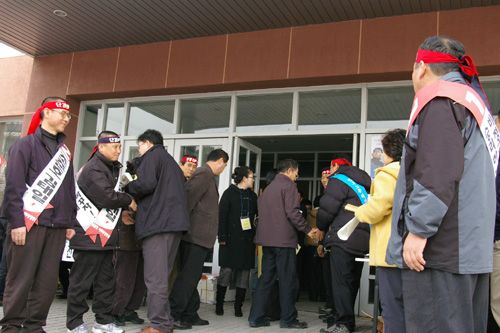 민주노총 37차 임시대의원대회가 애초 개회 시간인 2시에서 한 시간이 경과되었지만 시작하지 못하고 있다. 대의원대회 장소인 천안 상록리조트 유스대강당 안팎에는 현재 300여 명의 대의원들이 도착해 있는 모습이다.