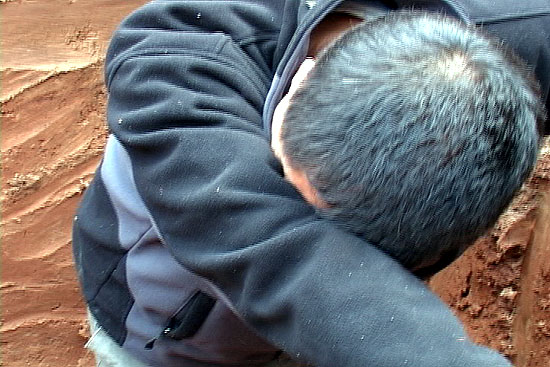 ▲ 향나무 판을 받던 신종원 이장은 끝내 구덩위안에서 눈물을 터트렸다. / 최은정 기자 |