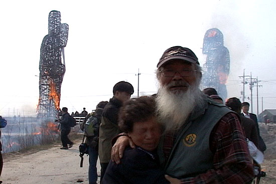 불타오르는 문무인상을 바라보던 주민들은 서럽게 울었다. 문득 지난해 봄, 황새울 들판에 포크레인이 들어올때 온몸으로 막아서던 주민들이 주저앉아 울부짖던 그 모습이 떠올랐다. 그렇게 싸웠지만 이제 떠나야 한다. 문무인상이 다 타오르기 전에 주민들과 지킴이들은 상여처럼 만든 평화의 꽃배를 앞세우고 만장을 들고 황새울 들판을 떠났다. 삶의 터전과 이별하는 마음은 대추초등학교로 한걸음씩 이동해 갔다.