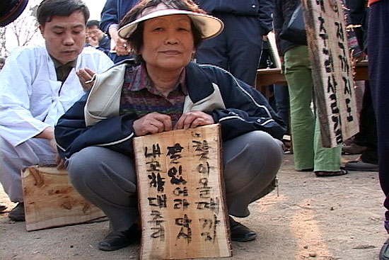 김월순 할머니는 '대추리 떠나기 싫다'는 향나무 판을 들고 서 있었다. "너무 속상해서 자꾸 눈물만 나올려고 그래. 여기서 이사 나가는거 처음이잖아. 60년 사는 건데 첨이지. 너무 가슴아프고 나가기 싫어, 나가기가 싫어. 자꾸 그 근방이 눈에 어려. 눈감고 있으면 막 집이 어려" 김월순 할머니는 이날 살던 집을 찾아가지 않았다. "집에 안가봤어. 접때 한번 가봤는데 문짝이 다 뜯어지고 보기싫어. 그래서 오늘은 안갔어"