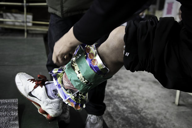 ▲ 농성이 장기화 되자 한 정규직 조합원이 회사 몰래 핫팩 등을 다리와 몸에 청테잎으로 붙여 비정규직 조합원들에게 전해주고 있다. |