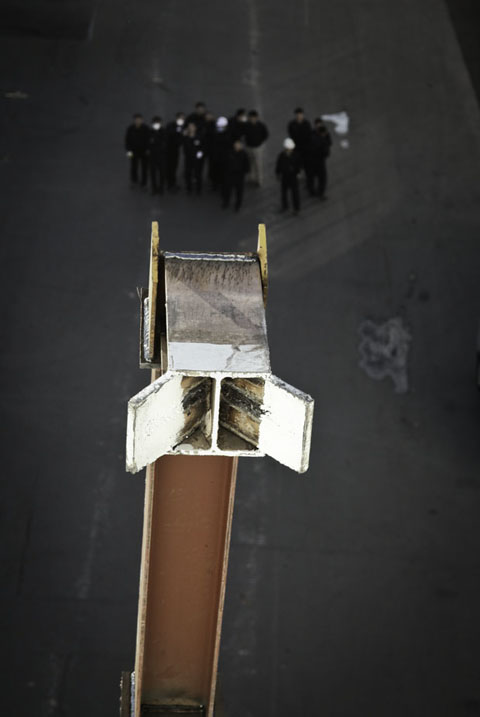 ▲ 회사는 12월 초 공장창문을 부수기 쉽게하기 위해 포크레인에 H빔을 달았다. |
