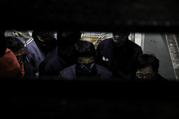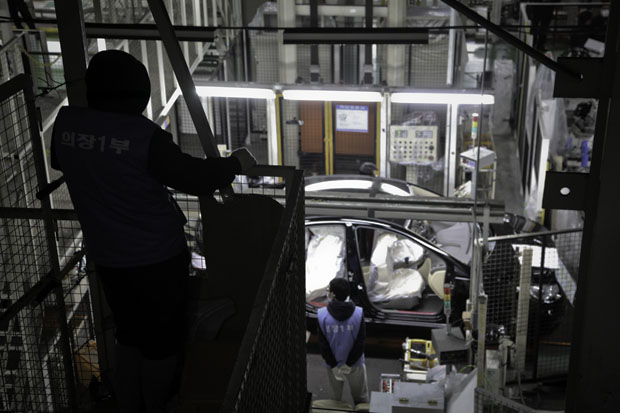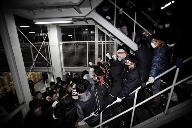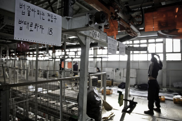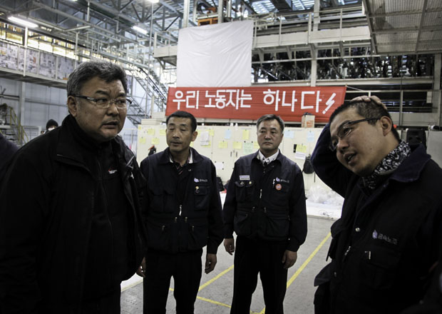 ▲ 2010.12.08. 1공장 1층 라인에 투입된 대체인력을 바라보고 있는 조합원 |